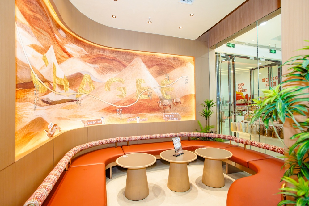 走进这家“摩登茶空间”,新疆地域文化与现代设计美学的融合处处可见:墙面打造的丝绸之路主题装饰,以视觉语言串联起千年文化脉络;座椅扶手、装饰细节等处嵌入的新疆传统地毯花纹,让地域特色从细节处自然流露;再搭配柔和的灯光、简约的空间线条,既营造出松弛的社交氛围,又传递出东方美学的雅致感,完美契合“都市生活驿站”的定位。